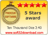 were impressed by the cleanliness of your program. According to our classification and to our test results, we decided to grant your product, Ten Thousand Dice 2.40, with a 5/5 Stars Rating and "5